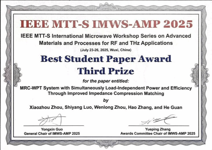 2025年7月23至26日,江苏省产业技术研究院和香港城市大学青岛研究院主办的国际微波系列研讨会(IEEE MTT-S International Microwave Workshop Series on Advanced Materials and Processes for RF and THz Applications)在江苏省无锡市成功召开。经过评审,会议最终评选出来自悉尼大学、上海交通大学、东南大学、电子科技大学和西北工业大学的6篇会议论文当选最佳学生论文奖,其中一等奖1名、二等奖2名、三等奖3名,西北工业大学微电子学院2023级硕士研究生周小舟凭借氮化镓高频磁谐振无线传能系统相关研究获得三等奖,指导教师为学院张浩副教授。