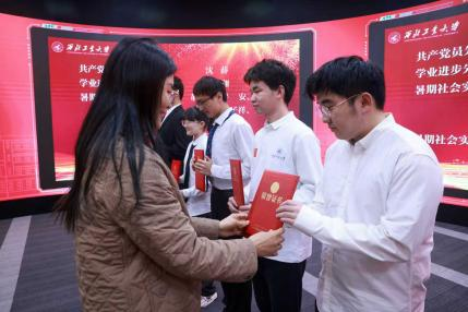 大会伊始,全体师生起立,奏唱中华人民共和国国歌。随后,杨妮花宣读了2025年学生表彰名单,并勉励同学们以先进为镜、向榜样看齐,既要仰望星空,也要脚踏实地,在追求卓越的实践中实现个人成长,主动将青春奋斗融入学校与学院的发展进程中,以实际行动践行时代使命。随后,马炳和、杨妮花、魏廷存分别为获奖学生集体和个人颁发荣誉证书。